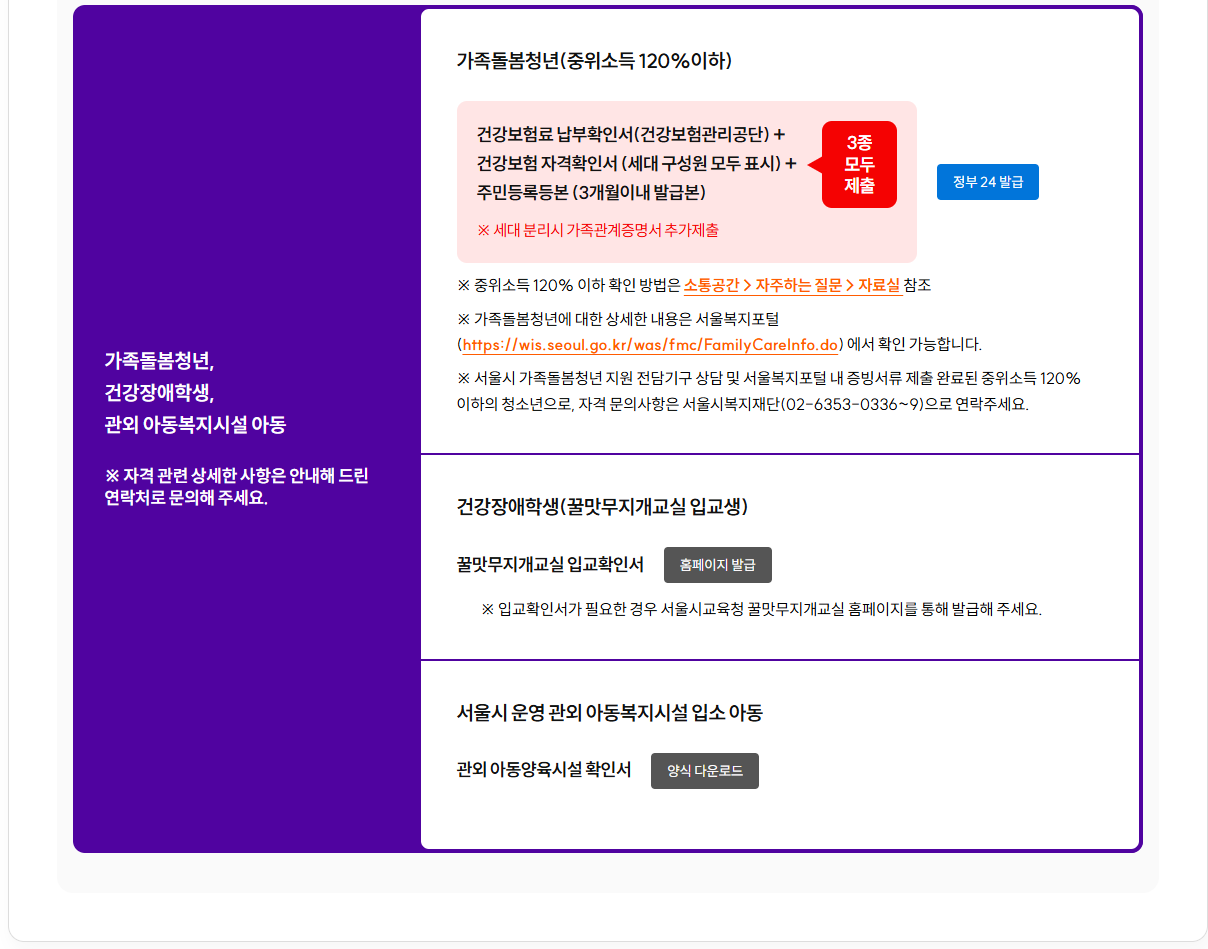 *중위소득 60% 이하. 법정 한부모가족,학교 밖,다문화 가족, 국가보훈대상, 북한이탈주민 청소년,가족돌봄청년,건강장애학생,관외 아동복지시설 입소 아동