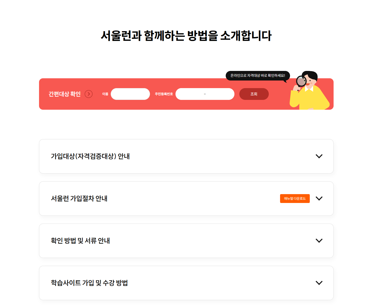 서울런 소개에 마우스를 올리시면 두 번째 회원가입 안내가 나옵니다. 거기를 클릭하시면 위와 같은 페이지나 나오는데, 간편대상 확인에 이름과 주민번호를 넣고 조회 버튼을 클릭하시면 대상에 간단히 확인이 가능합니다.